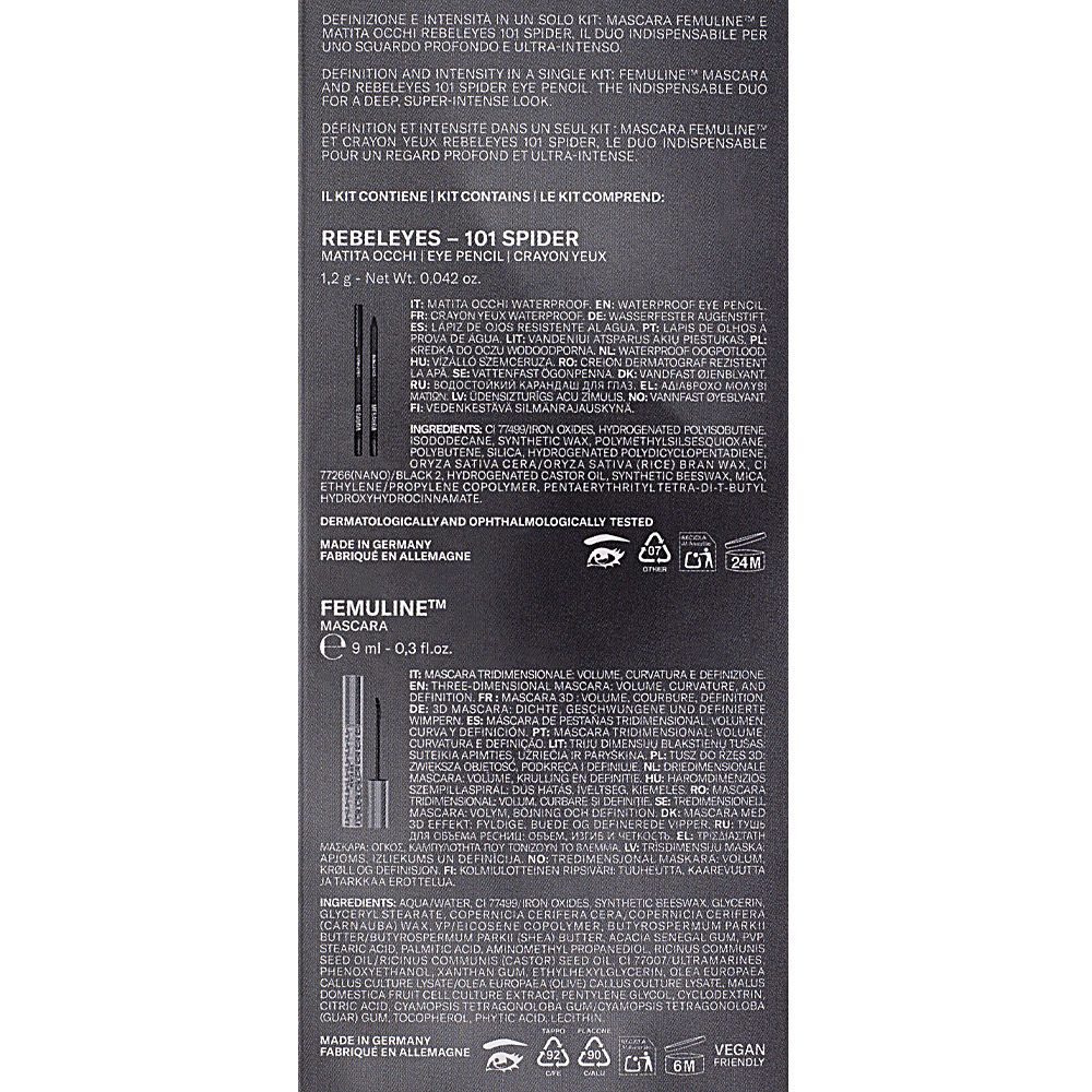 REBELEYES – 101 SPIDER: CI 77499/IRON OXIDES, HYDROGENATED POLYISOBUTENE, ISODODECANE, SYNTHETIC WAX, POLYMETHYLSILSESQUIOXANE, POLYBUTENE, SILICA, HYDROGENATED POLYDICYCLOPENTADIENE, ORYZA SATIVA CERA/ORYZA SATIVA (RICE) BRAN WAX, CI 77266[nano]/BLACK 2, HYDROGENATED CASTOR OIL, SYNTHETIC BEESWAX, MICA, ETHYLENE/PROPYLENE COPOLYMER, PENTAERYTHRITYL TETRA-DI-T-BUTYL HYDROXYHYDROCINNAMATE.
